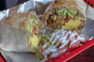 12 inch Tortilla With Egg, French Fries, Beans, Pico, Avocado, Jalapeño, Chipotle Sauce, Sour Cream and Cheese Served With Rice And Beans On The Side
